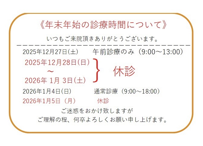 新規・再診の方・・・申し訳ございません、年内は予約で埋まっております。来年の1/9(金)以降、ご案内可能です。